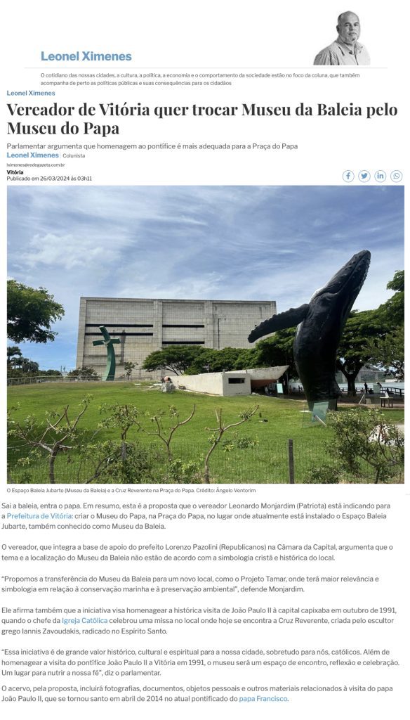 Vereador de Vitória quer trocar Museu da Baleia pelo Museu do Papa